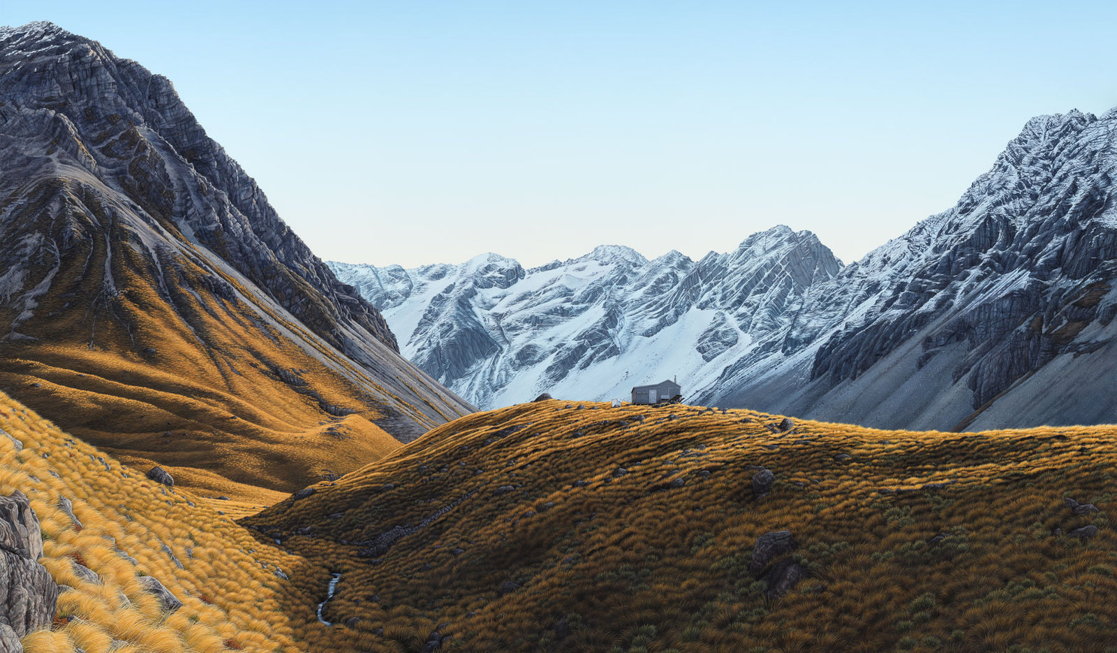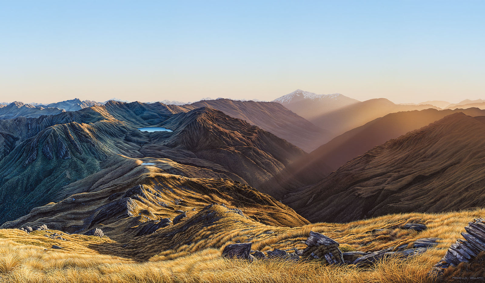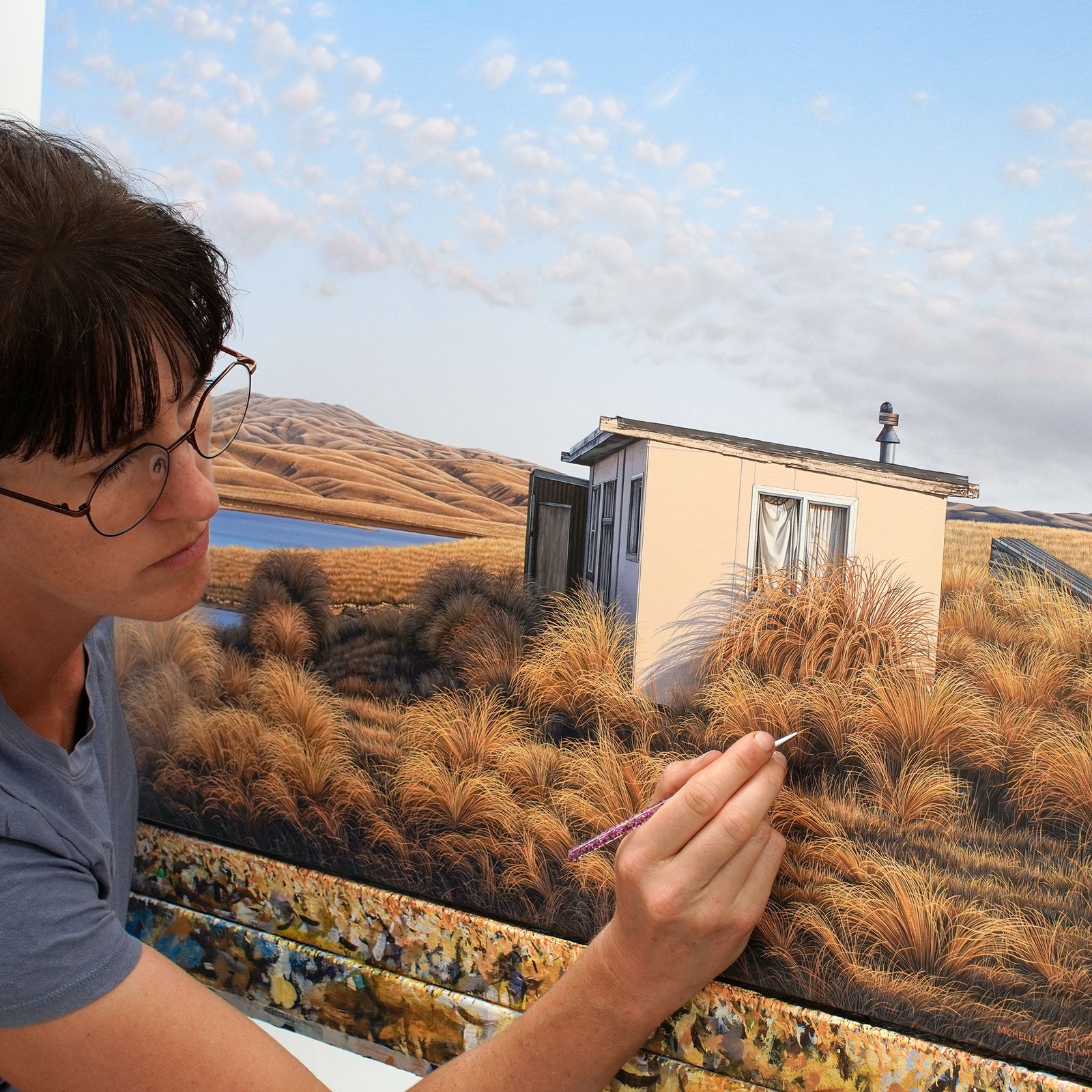 Michelle Bellamy is a contemporary New Zealand landscape artist and she is inspired by the land, back-country and outdoor culture of Aotearoa (New Zealand). She is drawn to back-country hiking huts, rustic buildings and mountain tarns, as Michelle spends much of her time outside, hiking, hunting, mountain biking & exploring the quieter places within New Zealand...