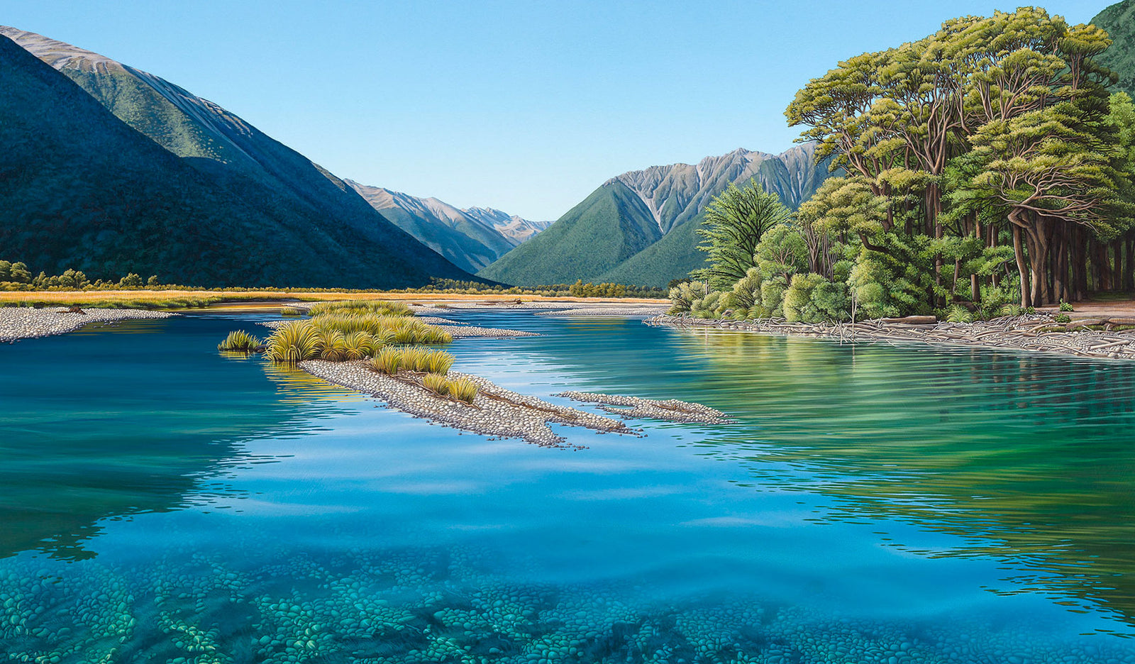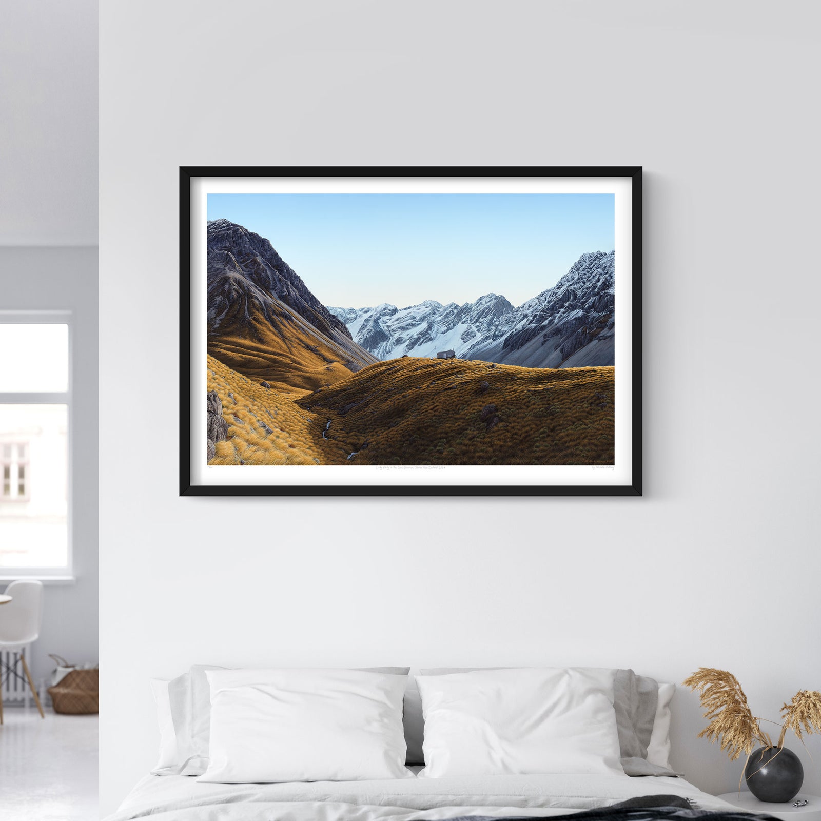 Here is the Travers River art print with the black frame in the 1000 x 714mm size looking very cool in a West Coast house. This print captures the iridescent turquoise and blues as the Travers River feeds into Lake Rotoiti in the Nelson Lakes National Park. Made with archival quality inks and on heavyweight papers, there are three sizes available to suit your space perfectly.