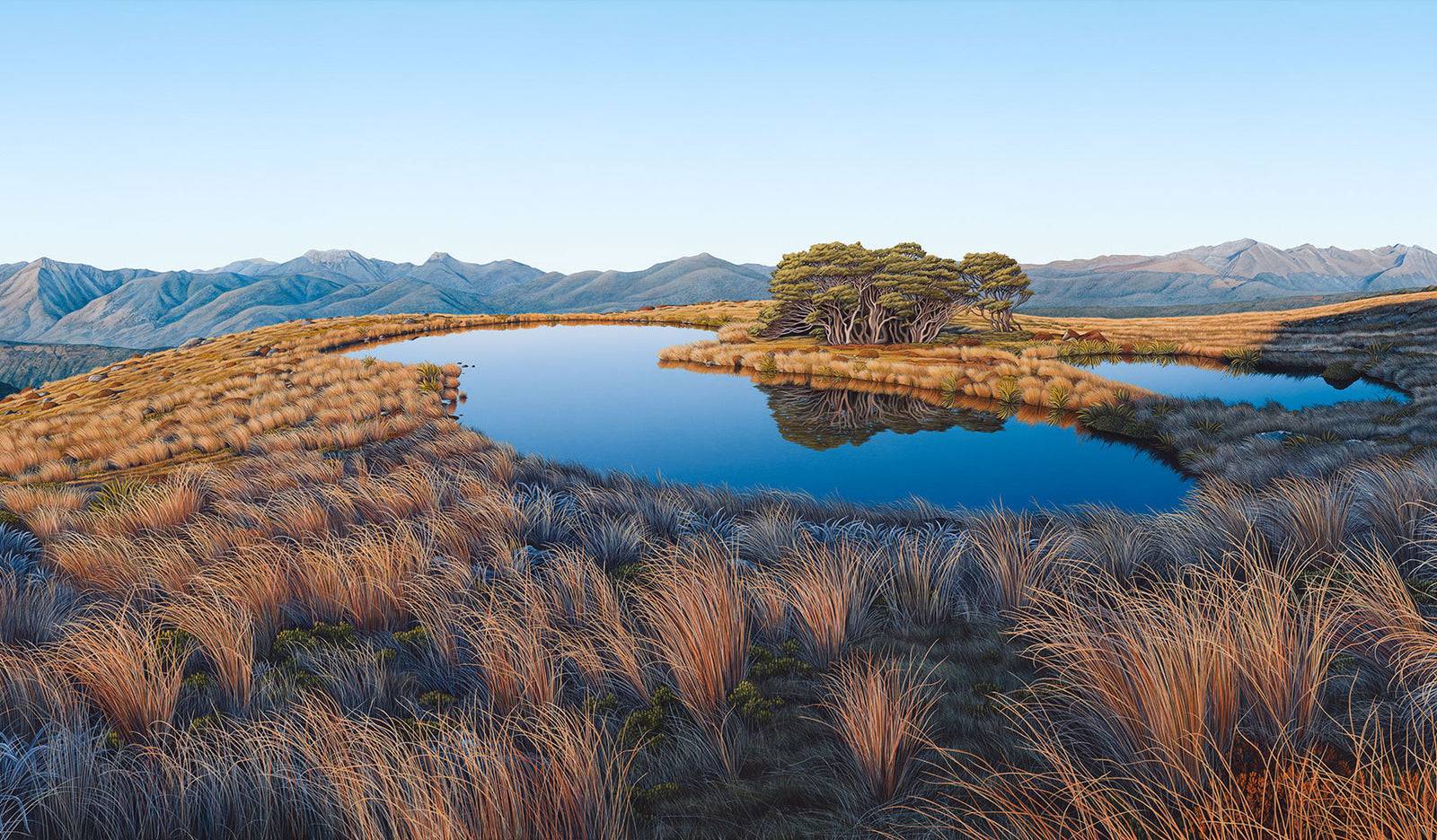 The Mole Tops Tarn painting is steadily progressing, I am currently alternating layering in the thick luminescent highlights and the detail strands of tussocks. Can't really rush this process...