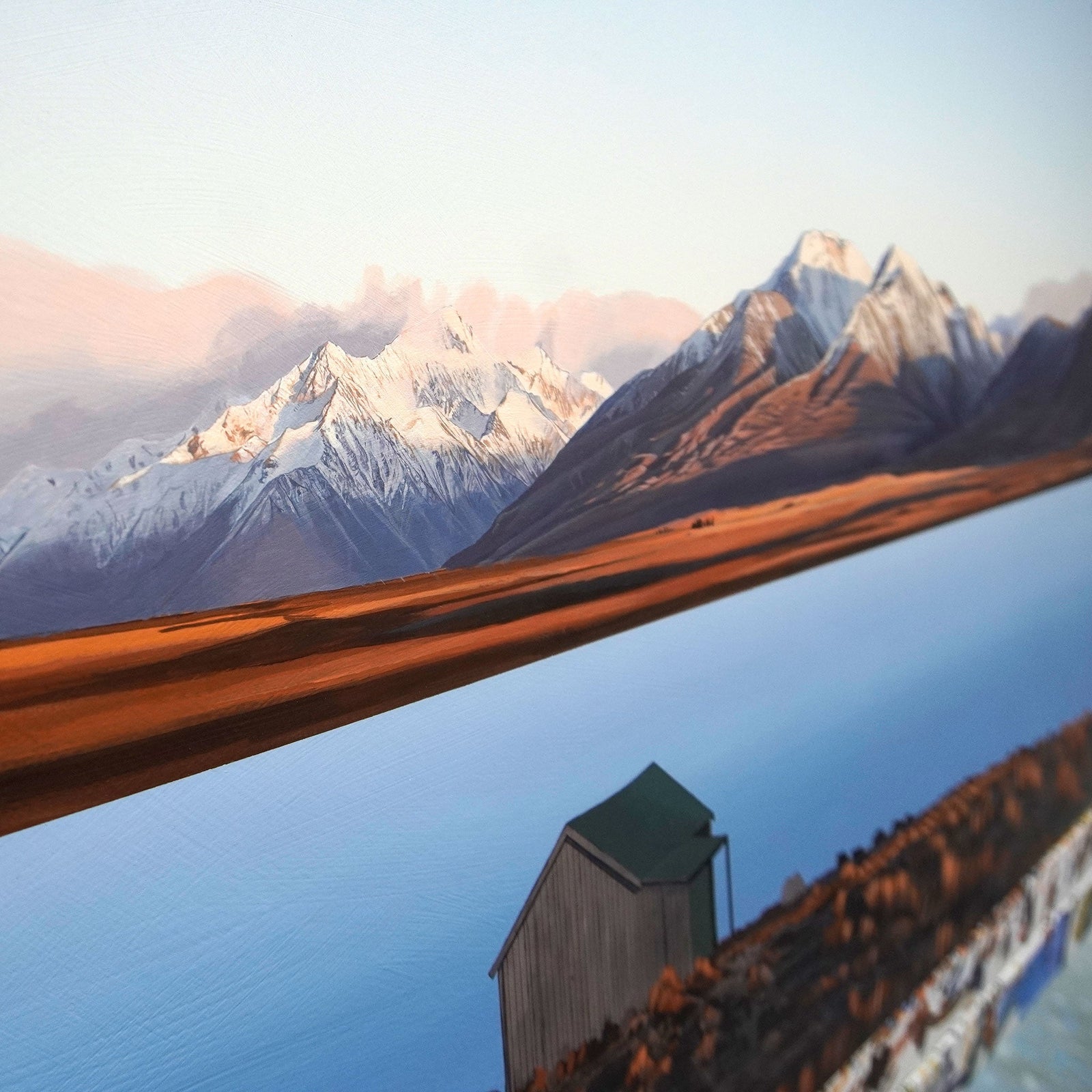 The Lake Emma painting is evolving into a masterpiece of gorgeous colour and detail. At 1200 x 700mm the space in this new work is allowing me to incorporate some very intricate detail in the mountains, and will allow me to also paint the fine sun-lit tussocks in the foreground.