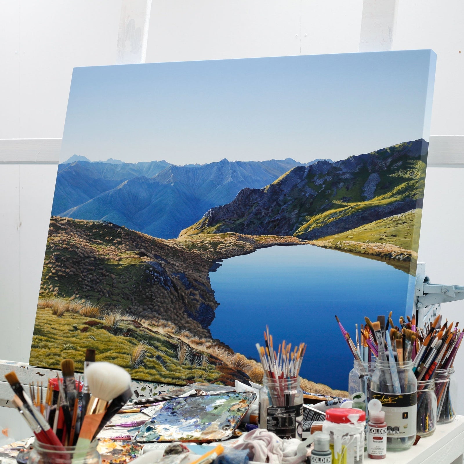 I’ve been keeping busy in the studio over the past few weeks, adding fine detail to current works and beginning to map out new scenes. Pictured here is one of the paintings I’m currently working on - a depiction of one of the tarns catching the morning light on the St Arnaud Range above