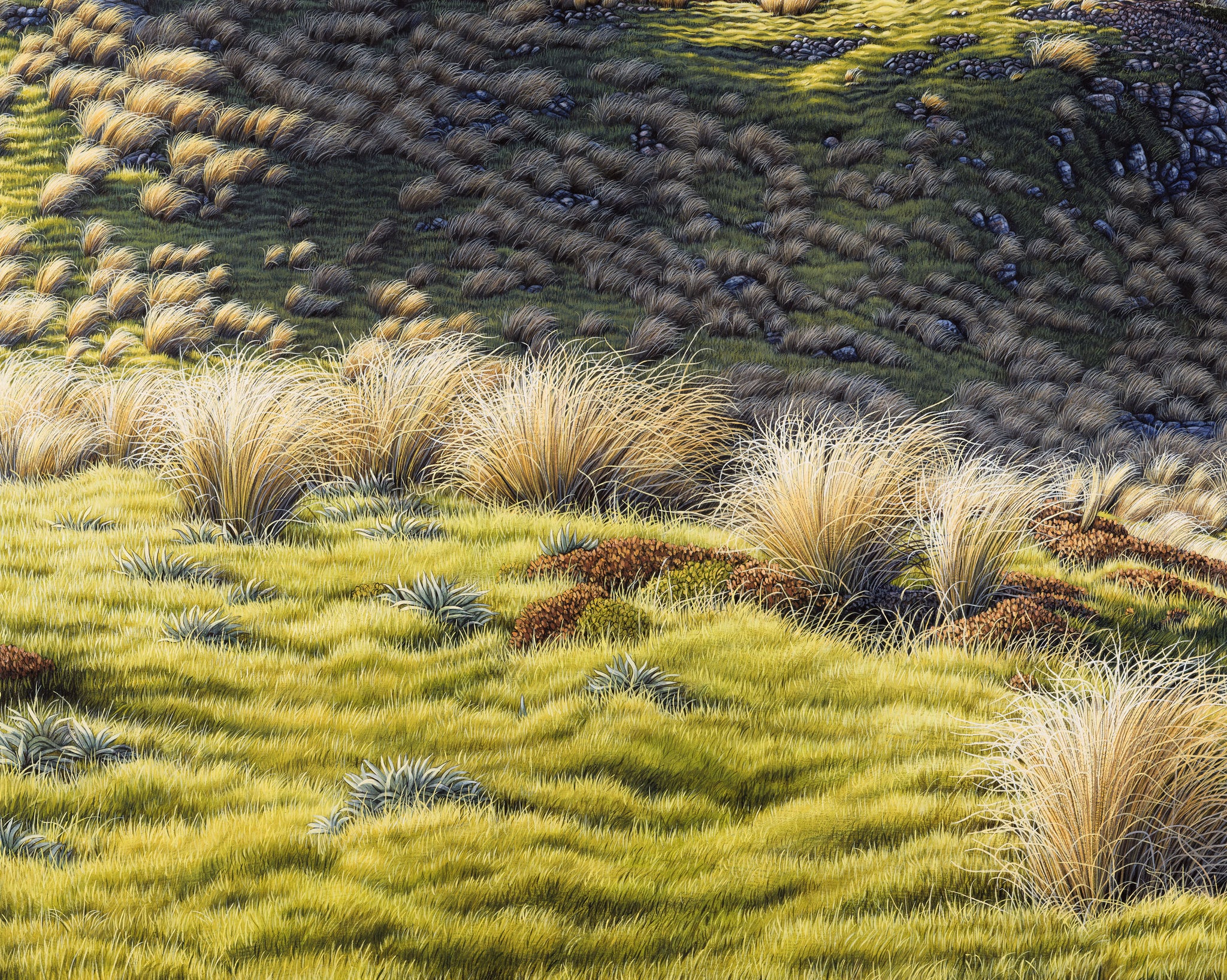 Both the broadest and tiniest details are captured here, from the sunbeams streaking through the ranges beyond to the distant tussocks surrounding the perfectly calm tarn. In the foreground there is a mix of bright green snowgrass, various mountain fauna and of course I had to include my tussocks in the foreground with every stand individually painted multiple times. It has been a labour of love portraying a spectacular place close to home that holds my heart.