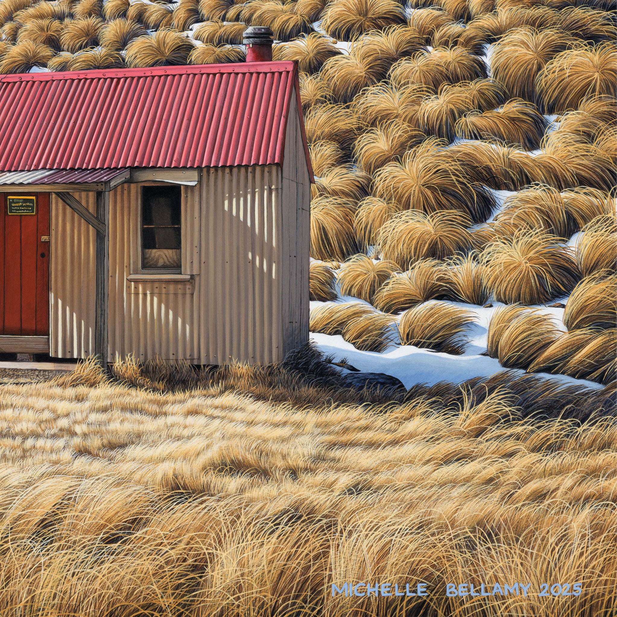 Middle Gorge Hut, Mistake River, Godley Peaks Conservation Area, New ZealandOriginal acrylic painting on cedar framed board By Michelle Bellamy600 x 600mmCompleted 2025SOLD
