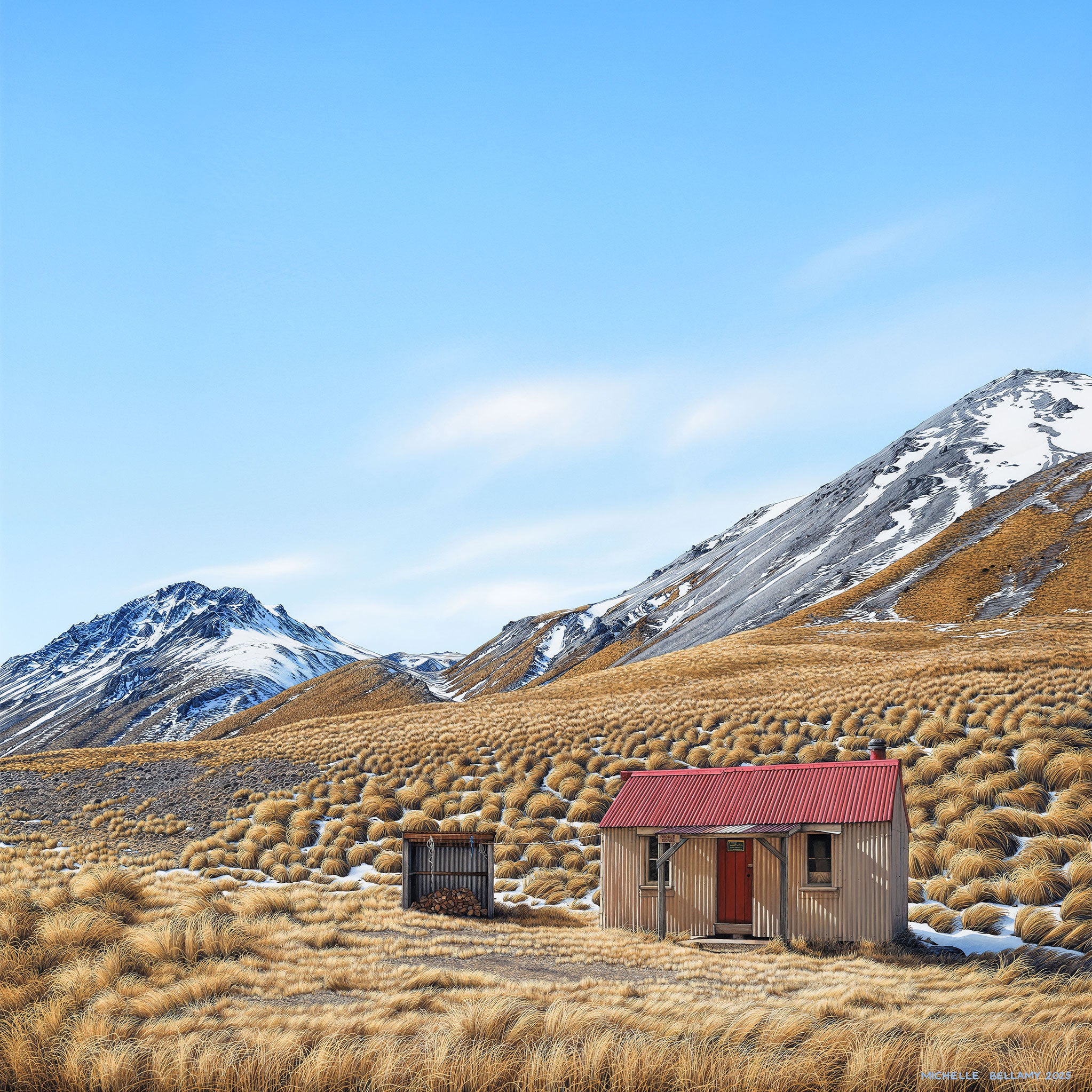 Middle Gorge Hut, Mistake River, Godley Peaks Conservation Area, New ZealandOriginal acrylic painting on cedar framed board By Michelle Bellamy600 x 600mmCompleted 2025SOLD